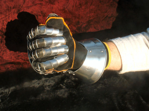 250,00€Prix pour la paire. Magnifiques gantelets d’armure en acier, totalement articulés, fixés sur un gant en cuir épais par une sangle en cuir, de la colle et des coutures en…