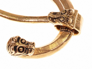 Splendide réplique de fibule viking à têtes d’animaux telles qu’on en a retrouvé à Haithabu, Birka et Gotland, datées du Xème siècle. Diamètre : 6cm Bijoux en bronze, ou bronze…