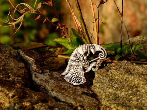 Fermoir en deux parties qui se crochètent ensemble pour attacher un vêtement (cape ou caftan par exemple). Forme de corbeau inspirée par des découvertes archéologiques vikings (Jaroslav, Russie, Xème siècle,…