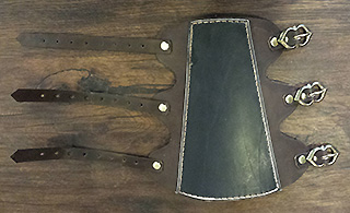 Bracelet en cuir se fermant par trois sangles à boucles, conçu pour protéger l’intérieur de l’avant-bras d’un archer du frottement de la corde.