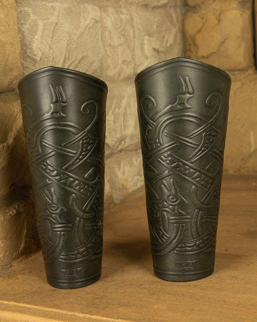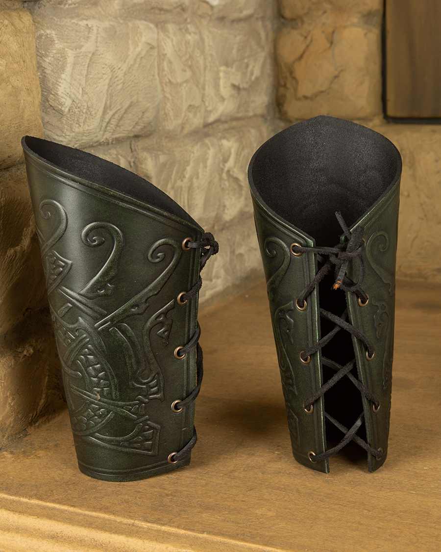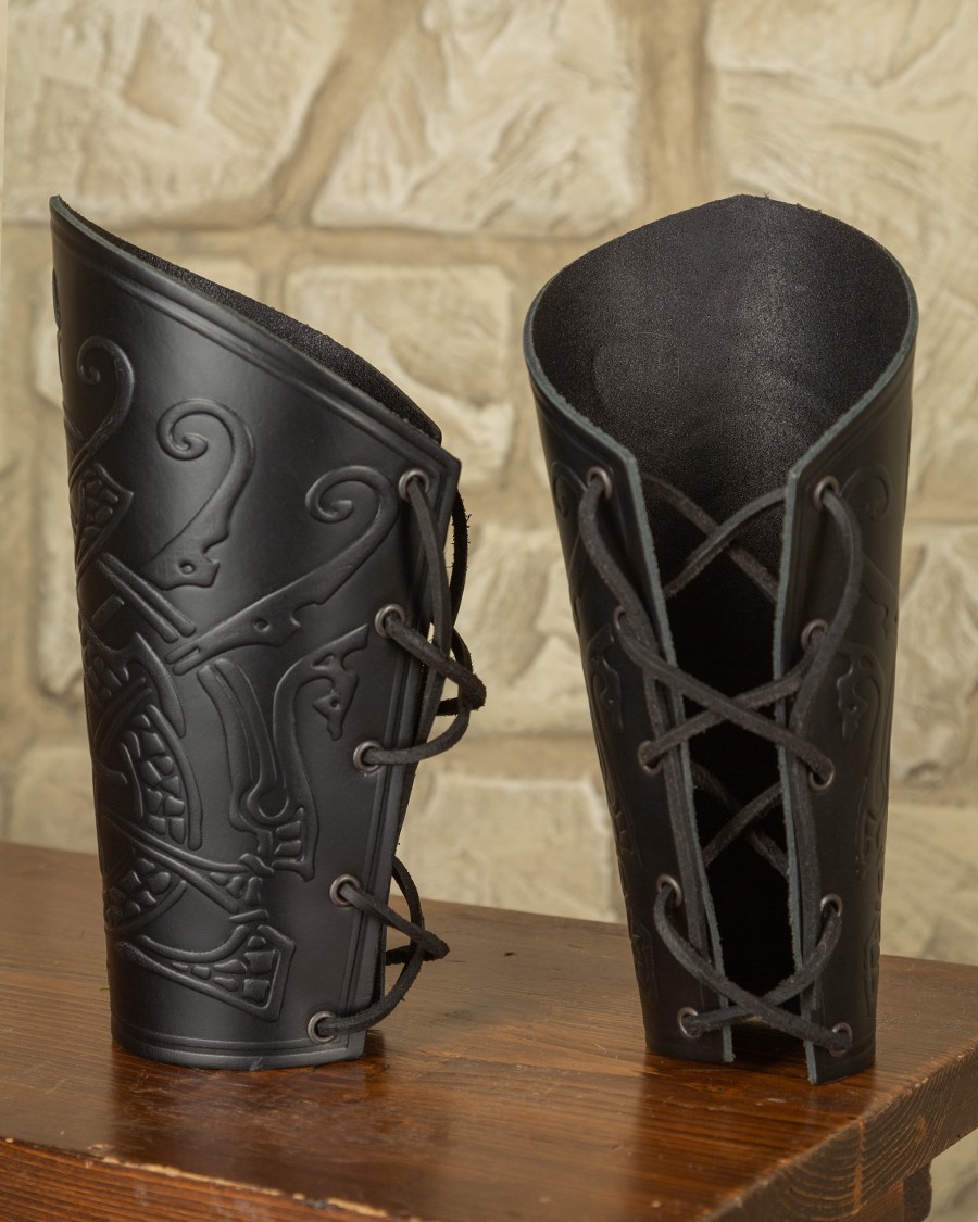 Bracelets en cuir couvrant l’avant-bras. S’attache par un lacet en cuir.