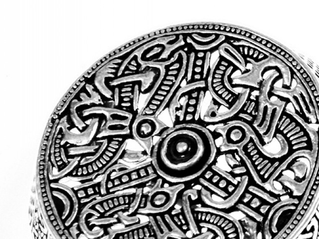 - Ce type de broches est appelé Dosspännen en suédois. Les motifs, dans le style Oseberg, représentent 3 animaux entrelacés.