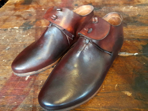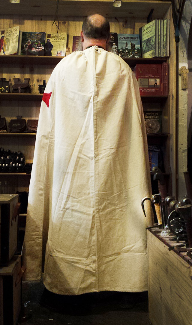 Cape de templier en coton épais écru avec croix rouge cousue sur l’épaule gauche. S’attache par une corde à nouer.