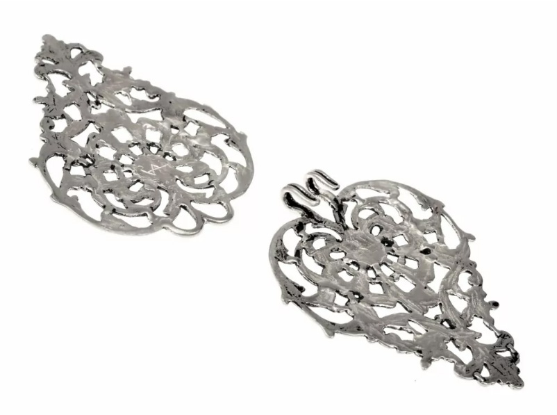- Le principe est de coudre chaque partie du fermoir sur une cape ou un manteau, avec un fil et une aiguille, en utilisant les nombreuses parties ajourées du motif.