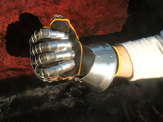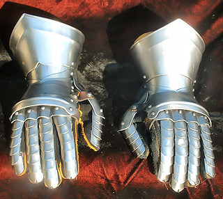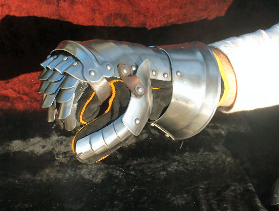 Magnifiques gantelets d’armure en acier, totalement articulés, fixés sur un gant en cuir épais par une sangle en cuir, de la colle et des coutures en bout de doigts. Ces gants offrent une excellente protection et sont conseillés pour du combat un peu « brutal » tel que du free-fight. Pour du combat chorégraphié ou du simple costume, nous conseillons les gantelets légers.