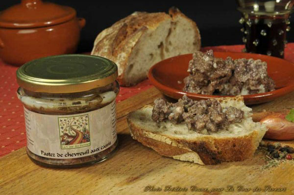 - Ingrédients : viande de Chevreuil 42 %, *viande et gras de porc, *foie de porc , *œufs, * vin blanc (contient des sulfites), *baies de cassis (2,7%), , sel, *persil, * vinaigre de cidre * hysope, *poivre, *sauge. Epices : cannelle*, girofle*, *estragon, *gingembre, *cardamome. sans colorant ni conservateur (*ingrédients issus de l’agriculture biologique)